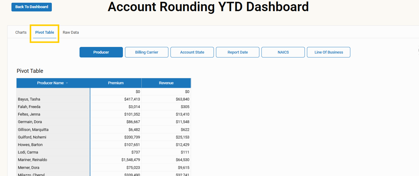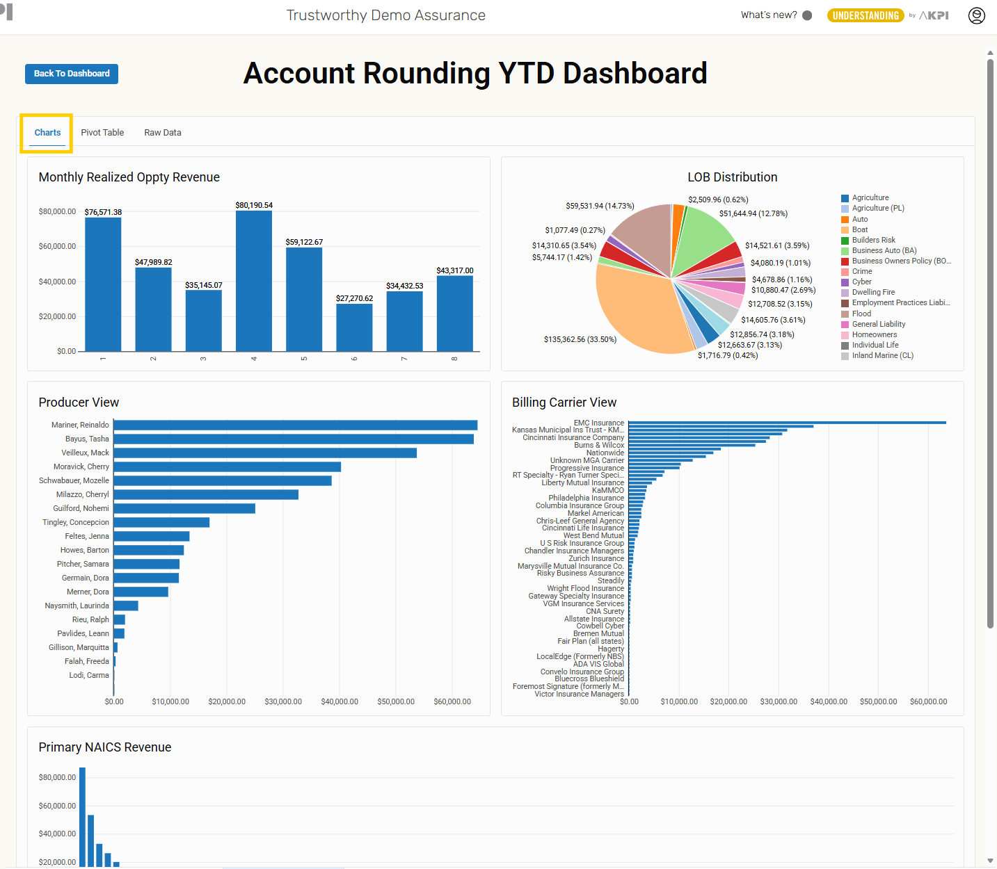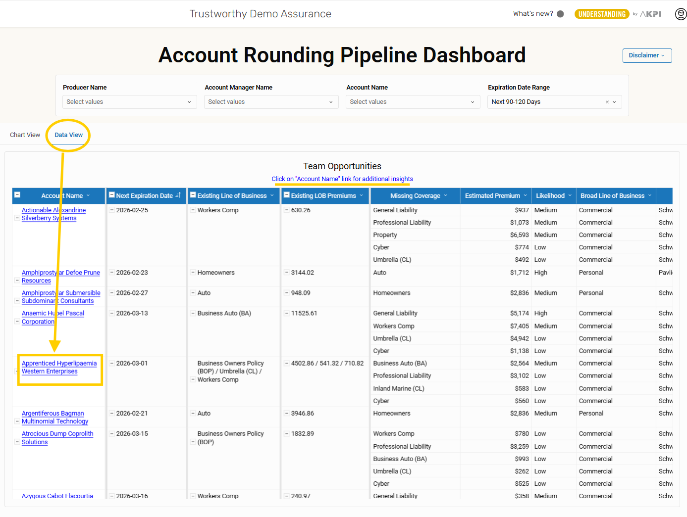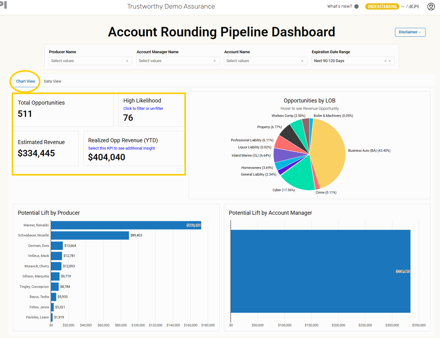 | Managers | Full Account Rounding Dashboard | Visualize potential revenue lift across producers, carriers, and lines of business; prioritize outreach; monitor upsell activity. |