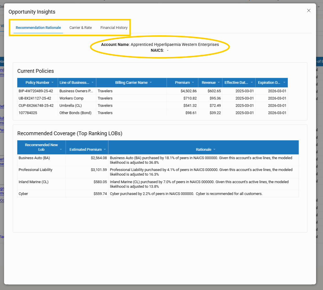 "This report is for informational purposes only. Recommended lines of business and estimated premiums are based on statistical models using NAICS codes, paired LOB relationships, and historical data. Estimated premiums are not quotes and may differ from actual underwriting results. Users should exercise professional judgment and verify all recommendations and pricing through appropriate quoting and underwriting processes before making any business decisions."